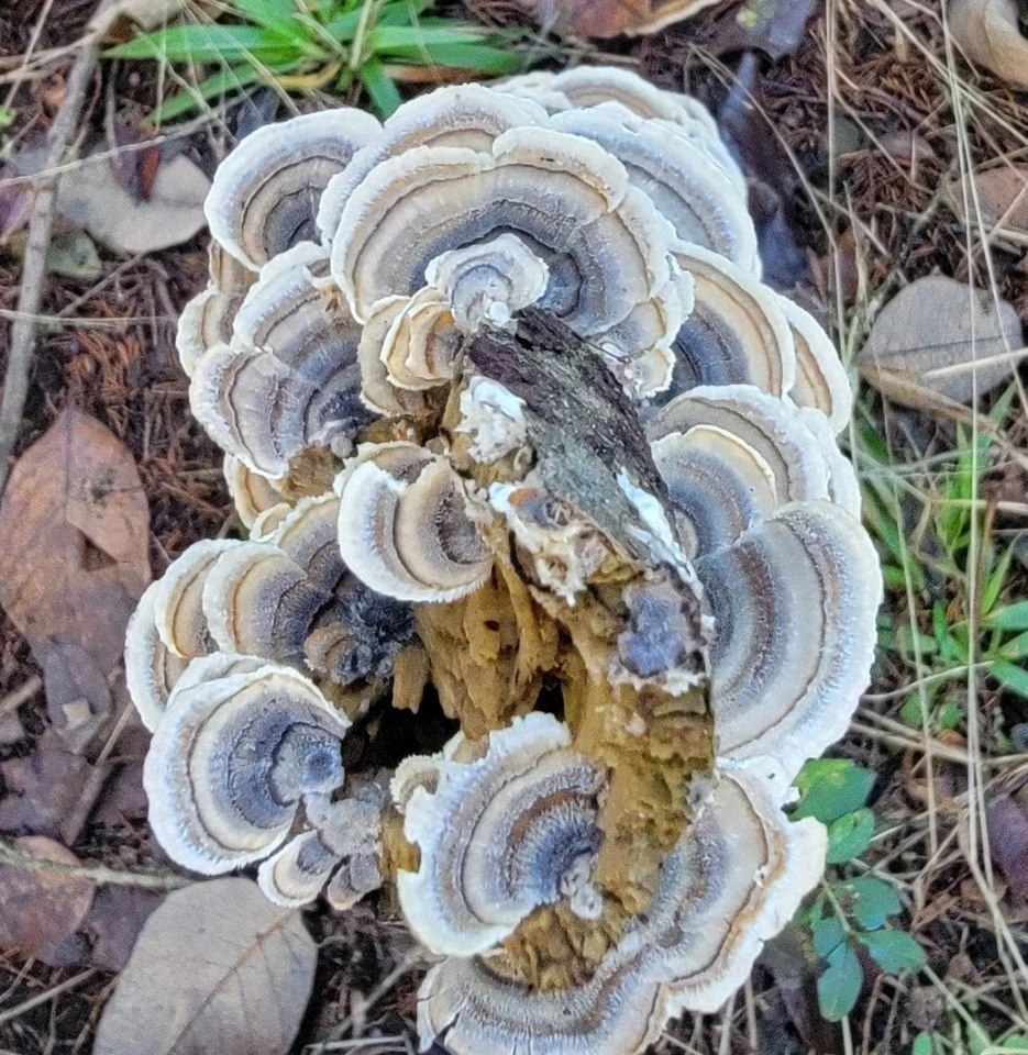 Cluster of turkey tail fungi growing on a decayed piece of wood among fallen leaves and grass.